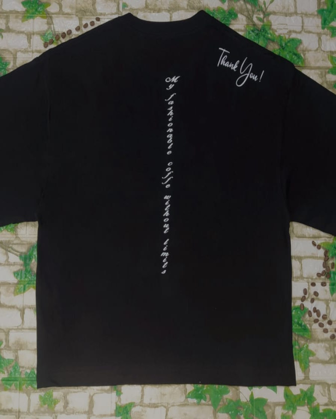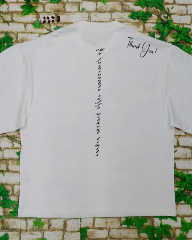 Polo de algodón boxy fit manga corta cuello redondo. Estampado logo en el pecho Estampado en el hombro (jhank You ) Estampado en la espalda frace vertical (My fashionable coffee without limits) Colores: Blanco, Perla, Negro, Verde militar Talla: S M